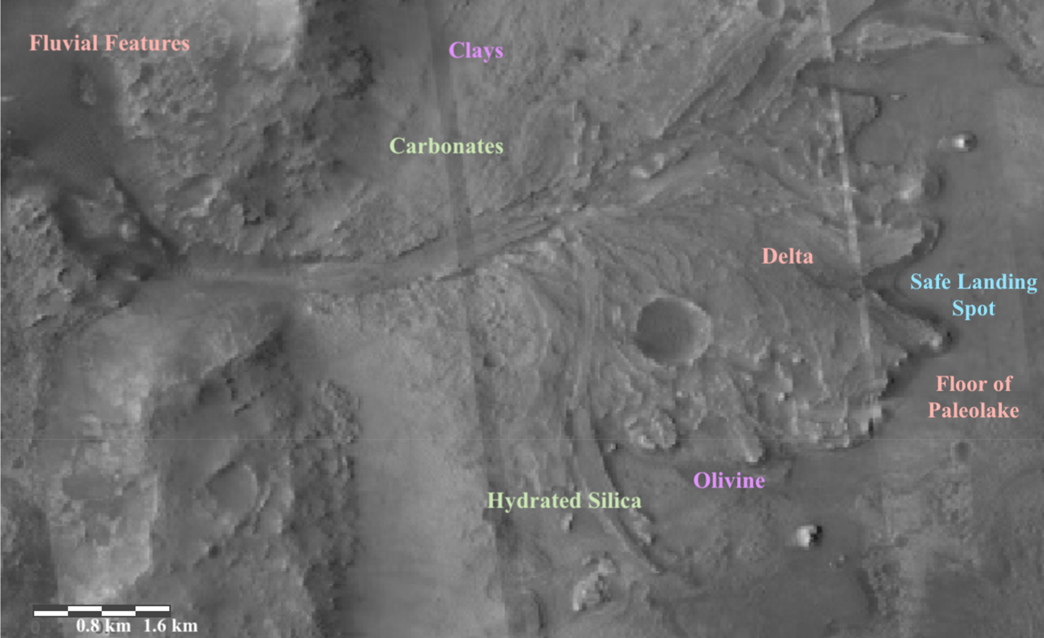It doesn’t take a highly trained scientist to notice Jezero Crater has a very interesting feature on its west side—a delta from an ancient river that flowed into what scientists believe was a lake that filled the crater. One of the landing site criteria was that the geologic processes that made the site had to be discernible, and while there is some disagreement about the age of these features in Jezero, it’s well agreed that this delta was formed by an ancient river. Because deltas on Earth are known to be very rich in nutrients and organics, the building blocks of life, and so the same is thought to be true on Mars. Upon closer examination, teams of scientists found clays, carbonates, and possible hydrosilicates, all of which are good indicators that signatures of organic matter might be found at the site. Jezero has been deemed safe for the landing and operating of the Mars Perseverance Rover, and there are a wide variety of rocks and minerals here for collecting. It’s also close enough to Midway where the rover could potentially travel out to that site as well.