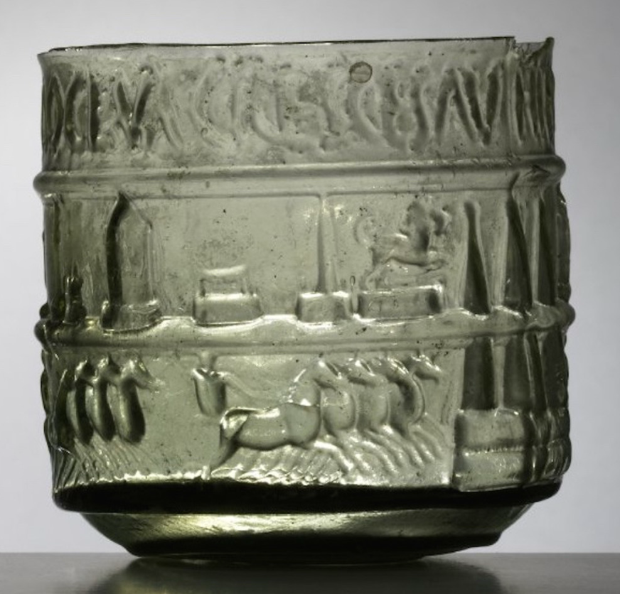 Like many people today, ancient Rome loved their spectator sports, particularly chariot racing and gladiatorial matches. And also like today, one could find every echelon of society at these games, from the poor to royalty--in the case of Rome, even the emperor himself. Suetonius reported that Gaius Caesar Augustus Germanicus (you might know him better as Caligula, but that's just rude) was a huge fan of the Green faction of charioteers, and gave one driver two million sesterces in sponsorship. Yes, while corporations sponsor teams today, individual people did in ancient Rome. That's an article for another day. But people in ancient Rome collected glasses that commemorated their favorite drivers and fighters.